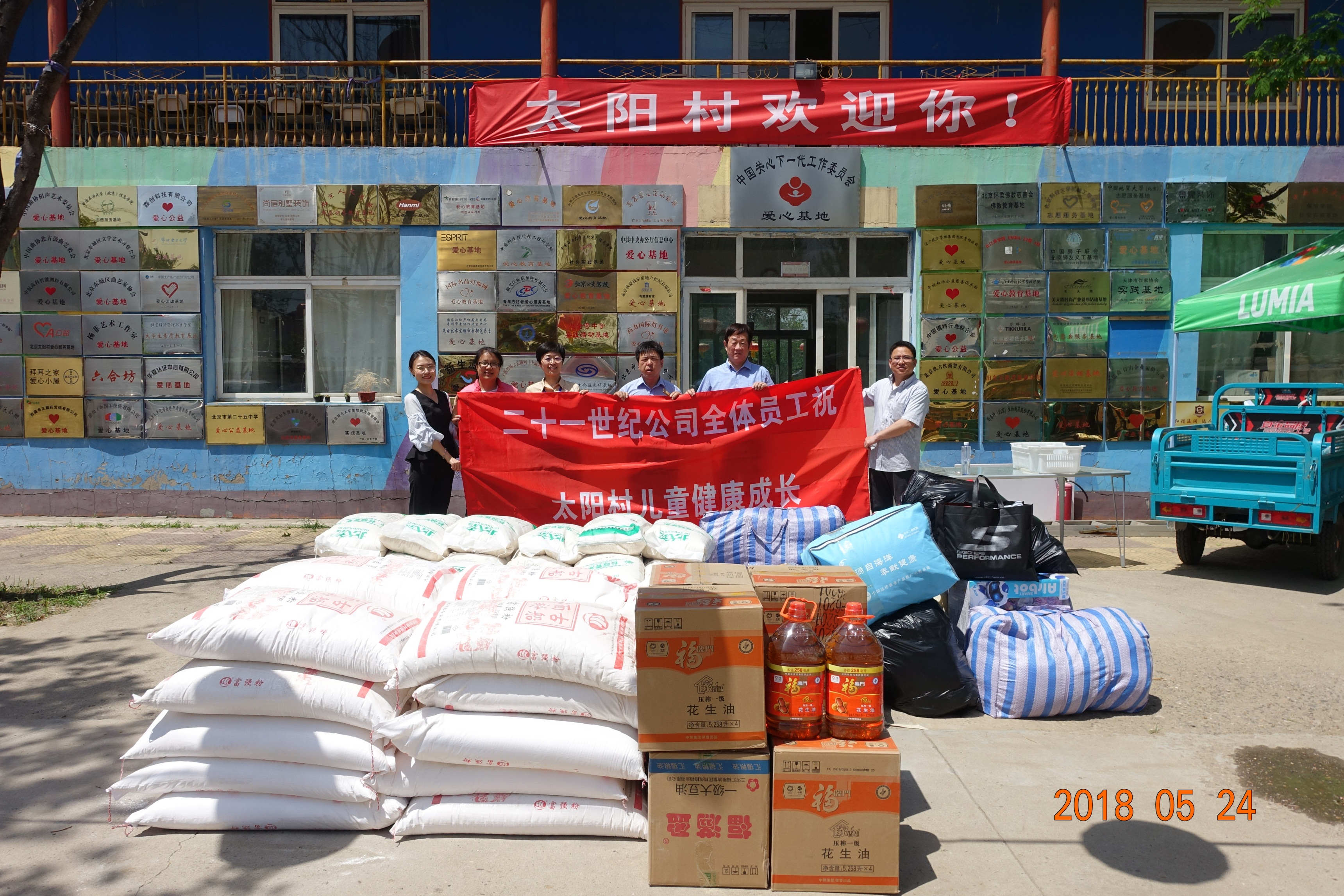 2018年5月24日,公司爱心志愿者在工会主席吴凡的带领下,带着米、面、食用油等生活用品及员工捐赠的衣物,前往位于顺义区赵全营镇板桥村的太阳村开展捐赠慰问活动。