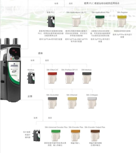 卡扣式选配模块可帮助您根据自己的需要定制驱动器提供 18 种不同选项,包括 Fieldbus、以太网、I/O、反馈附件和自动化控制器。