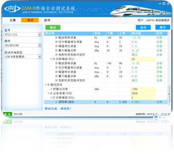 该系统可以完成目前铁路GSM-R/GPRS终端设备发射机和接收机射频指标的全自动检测,测试精度和准确度均达到业内良好水平,该系统具有测试信息和设备信息电子台帐管理功能;对测试结果进行自动合格性判断,并形成电子台帐;测试结果可下载并打印;可记录所测电台的型号、编号、测试人和测试日期;具有对测试记录存储和查阅的功能,可帮助现场测试人员轻松完成定期指标检测及数据记录工作。