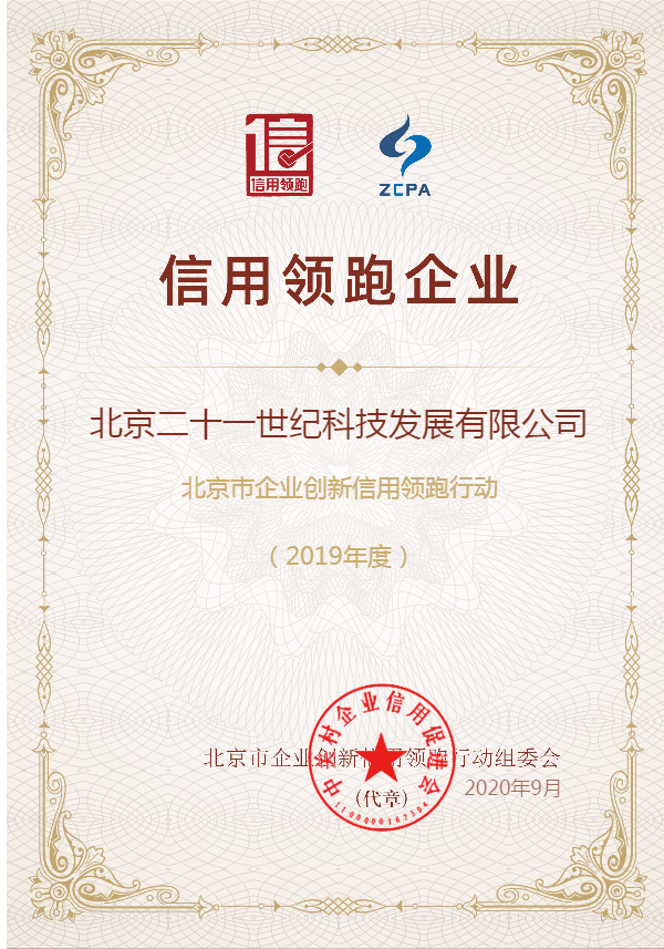 近日,北京市企业创新信用领跑行动入围企业名单正式公布,我公司经过层层选拔成功入选,荣获2019年度“北京市企业创新信用领跑企业”荣誉称号。